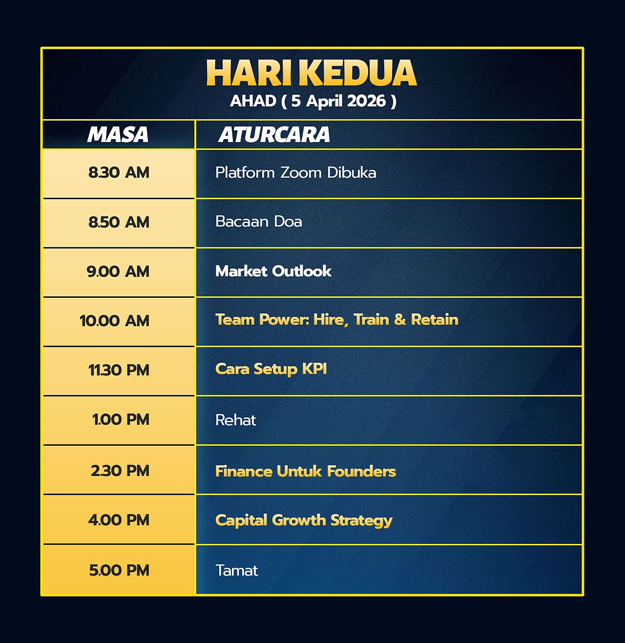 ▶️ Seminar ini kami akan kongsikan “11 Modul” yang merangkumi strategi & formula capai RM 1 Juta pertama dalam Sales/Profit/Cash Reserve.
